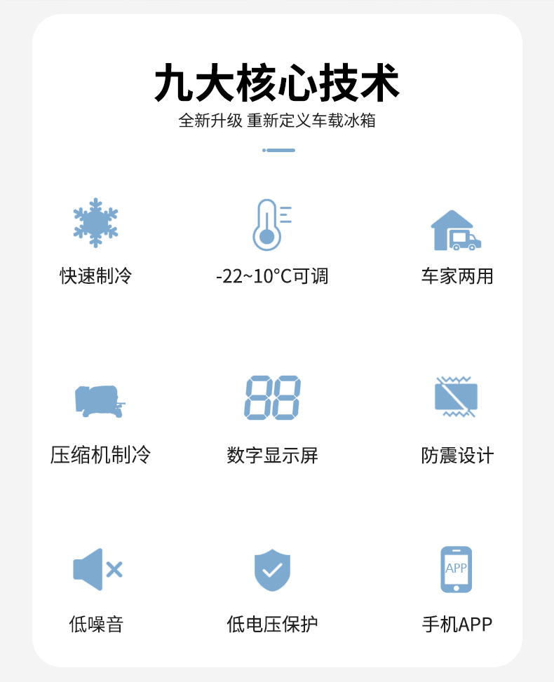 【智能控温】车载冰箱温度可通过蓝牙或数字屏上的按键控制。你可以通过手机上的蓝牙监控冰箱的温度。