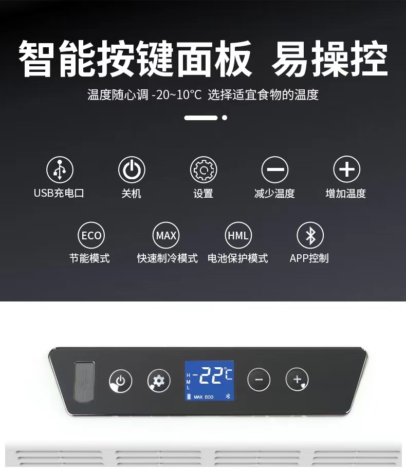 【智能控温】车载冰箱温度可通过蓝牙或数字屏上的按键控制。你可以通过手机上的蓝牙监控冰箱的温度。【电池保护】适用于交流和直流供电,配有3级电池显示器,保护电池。【低功耗】具有优良的低压保护功能,降低能耗。