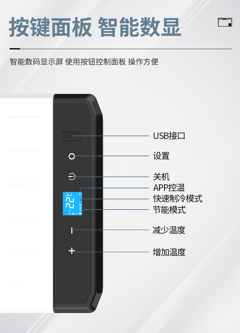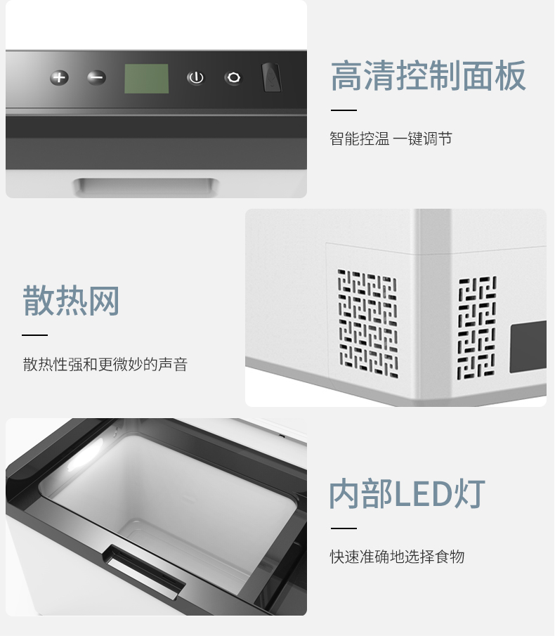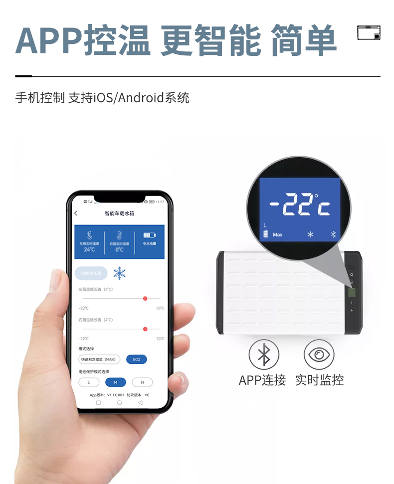 【智能控温】车载冰箱温度可通过蓝牙或数字触摸屏上的按键控制。你可以通过手机上的蓝牙监控冰箱的温度。【电池保护】适用于交流和直流供电,配有3级电池显示器,保护电池。【低功耗】具有优良的低压保护功能,降低能耗。