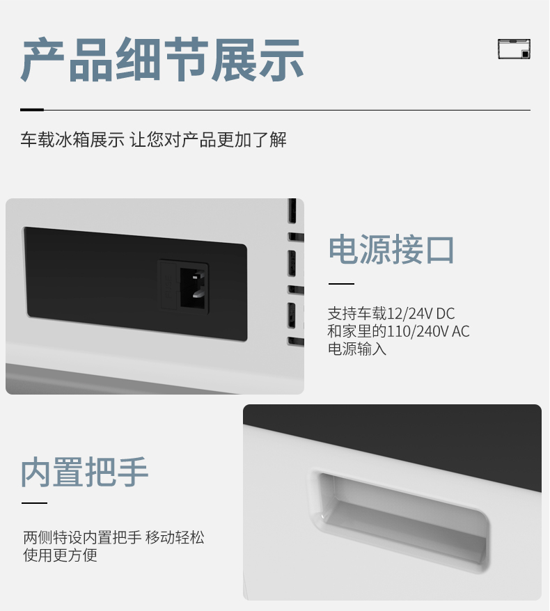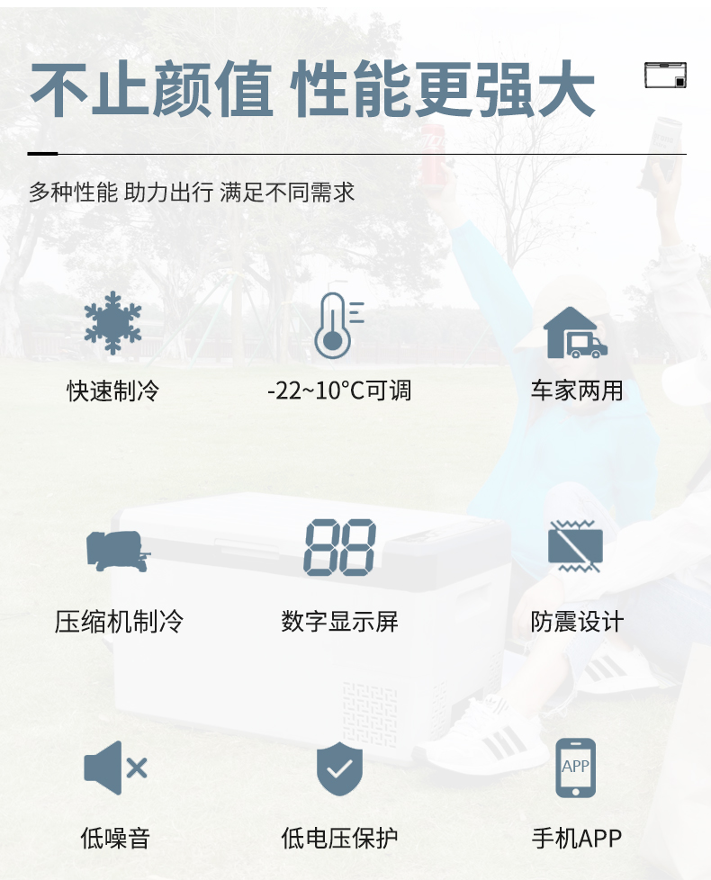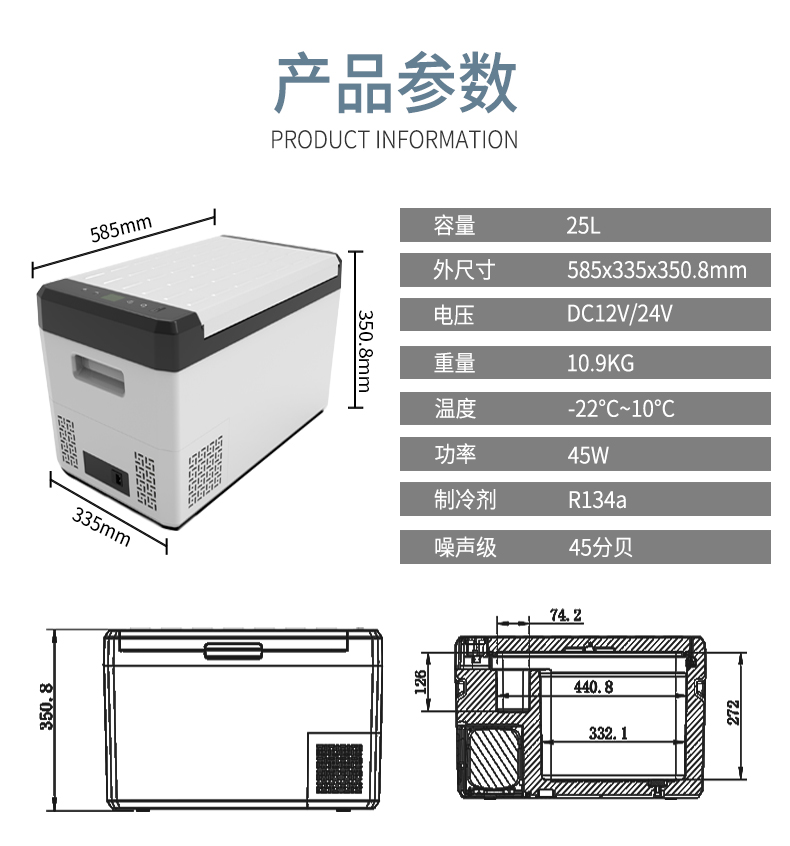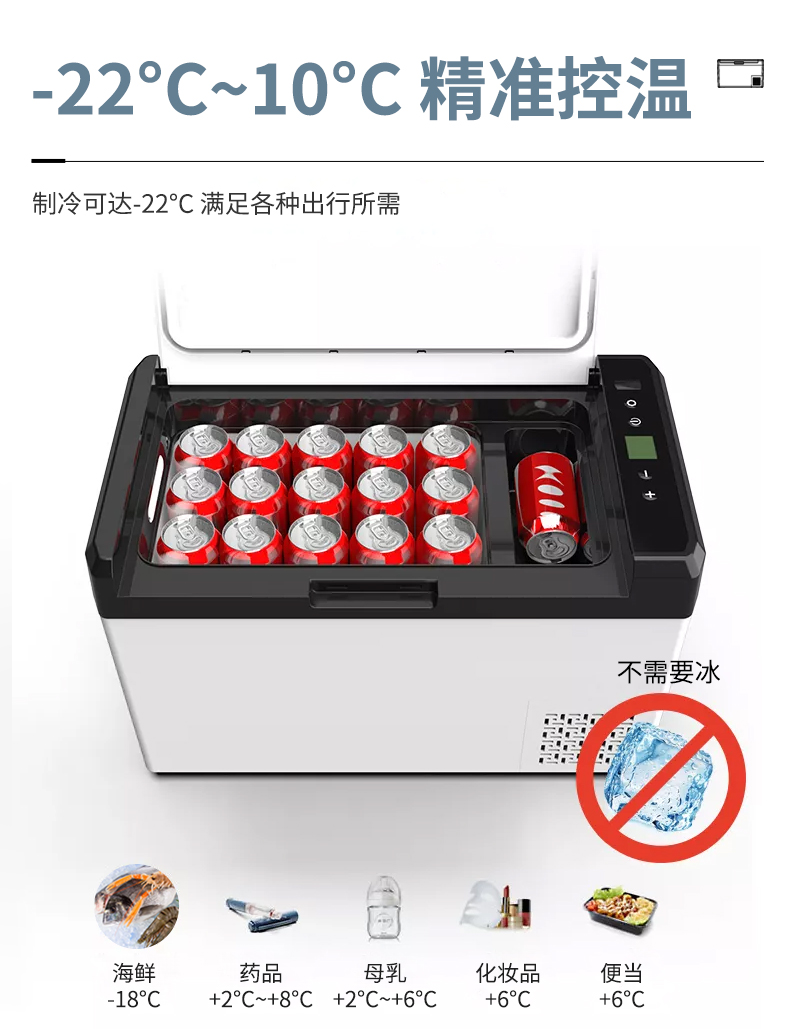 【容量】25L汽车冰箱是2-3天自驾游、周末狩猎、野营的理想选择。【设计】冰箱采用顶开设计,减少空调损耗,有利于节能。【压缩机冰箱】采用压缩机冷却技术,快速冷却至-22℃~+10℃,运行安静。