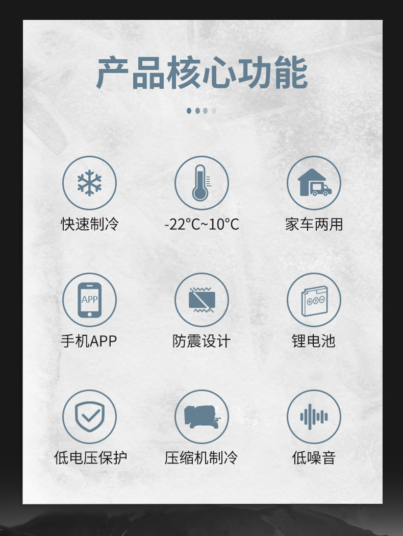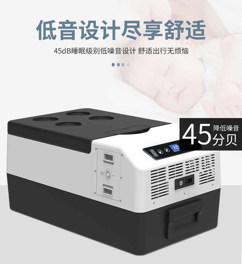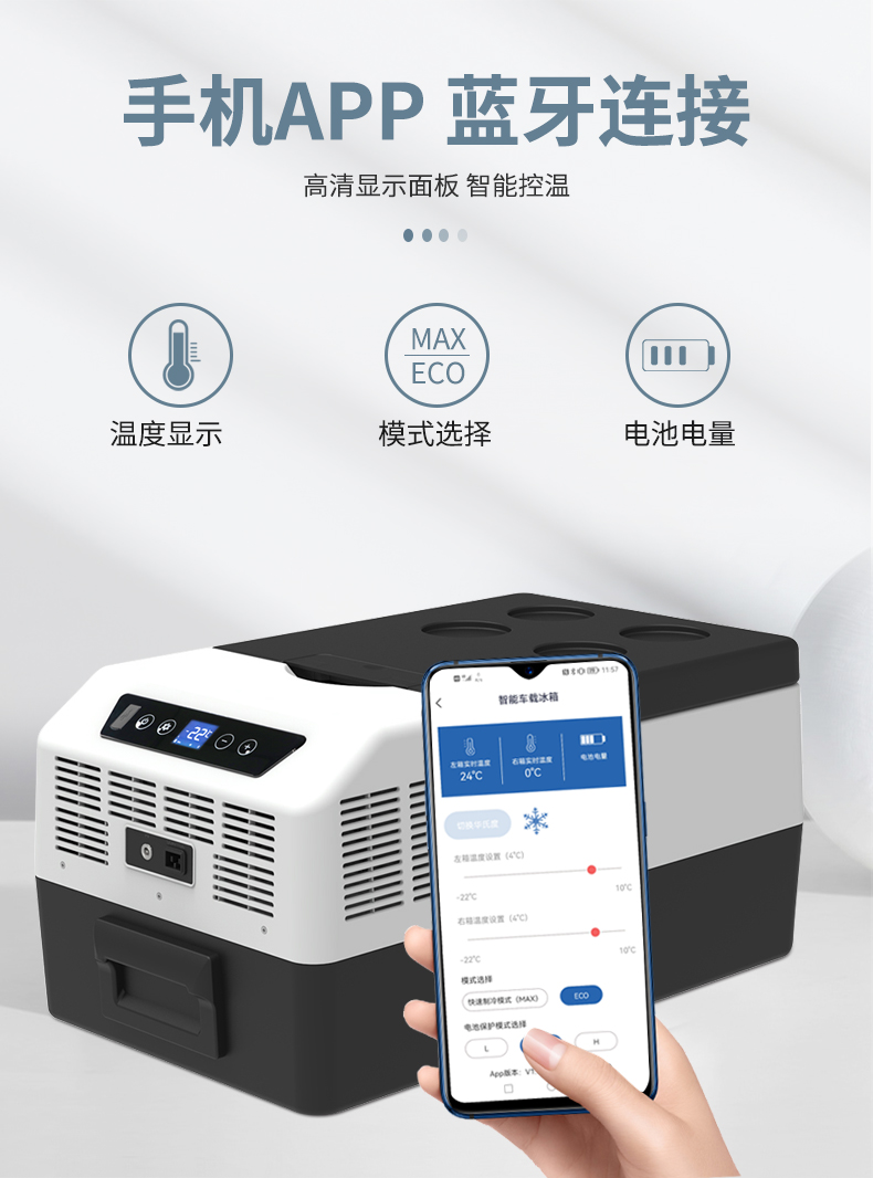 【智能控温】车载冰箱温度可通过蓝牙或数字屏上的按键控制。你可以通过手机上的蓝牙监控冰箱的温度。【电池保护】适用于交流和直流供电,配有3级电池显示器,保护电池。【低功耗】具有优良的低压保护功能,降低能耗。